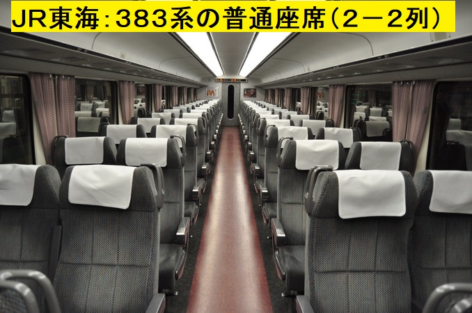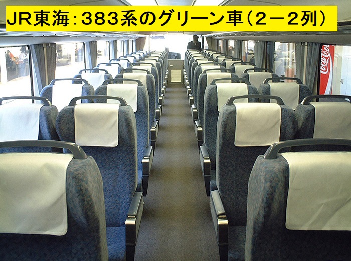 車両の客室は、普通車、グリーン車の2種類、窓が大きく座席のひじ掛けと窓枠が373系